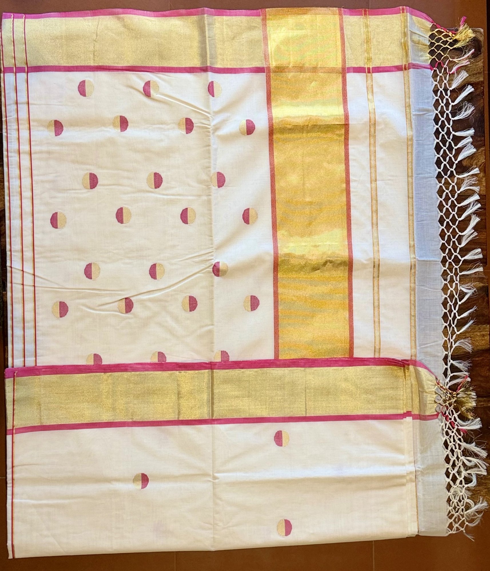 Pure Handloom Kerala Kasavu Saree with Pink Polka Dots & Gold Kasavu Border