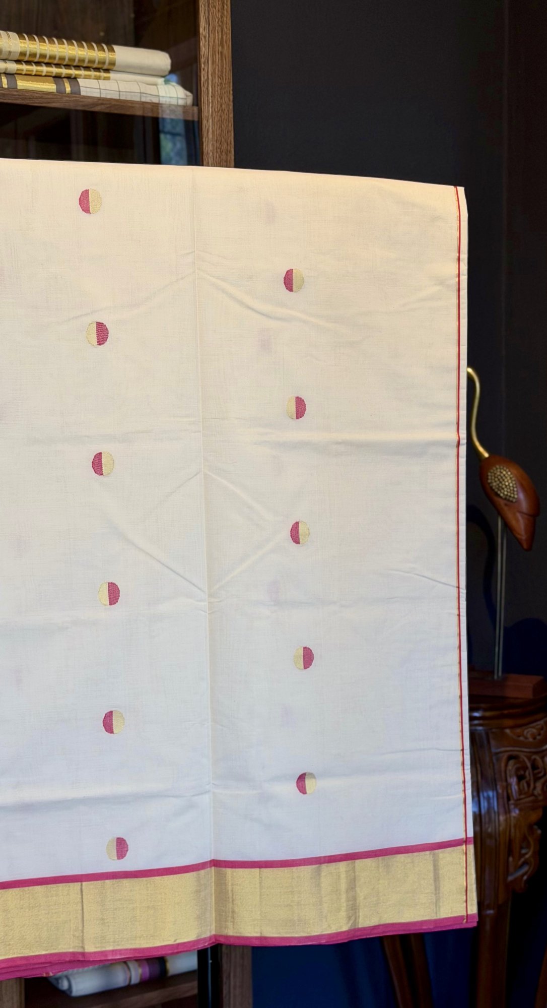 Kerala Kasavu Saree with Pink Polka Dots & Gold Kasavu Border